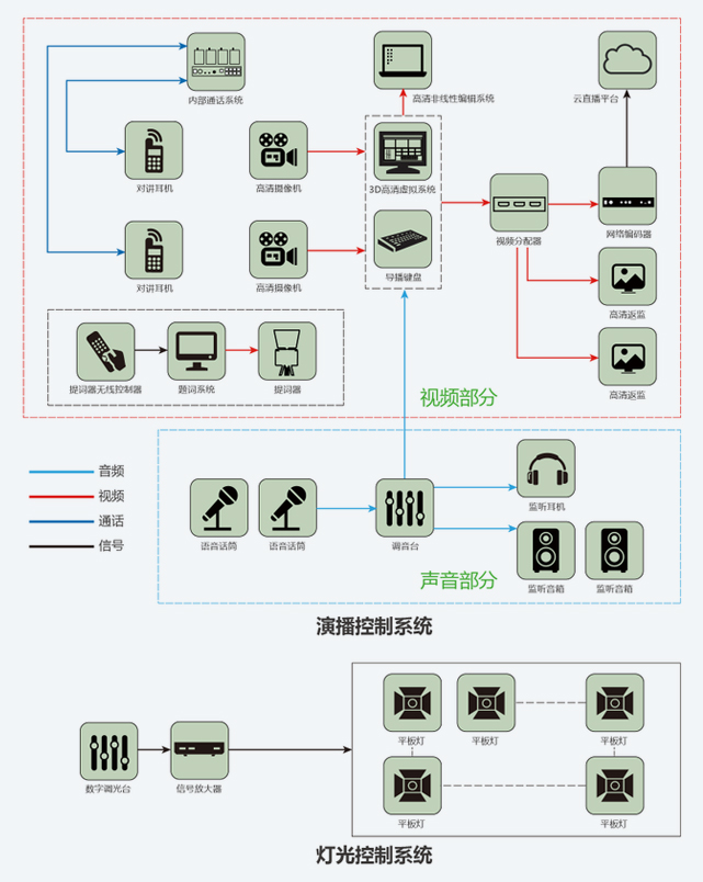 校园电视台由4K虚拟演播室系统、视频采集系统、非线性编辑系统、流媒体系统、现场监看、音频系统、LED灯光系统、蓝箱八大部分组成,是供学校自行拍摄、制作各种电视节目录像,如领导讲话、优秀示范课、教师访谈录、小型文艺节目、新闻节目等,并具有现场直播、录播、转播、转录等多种功能。