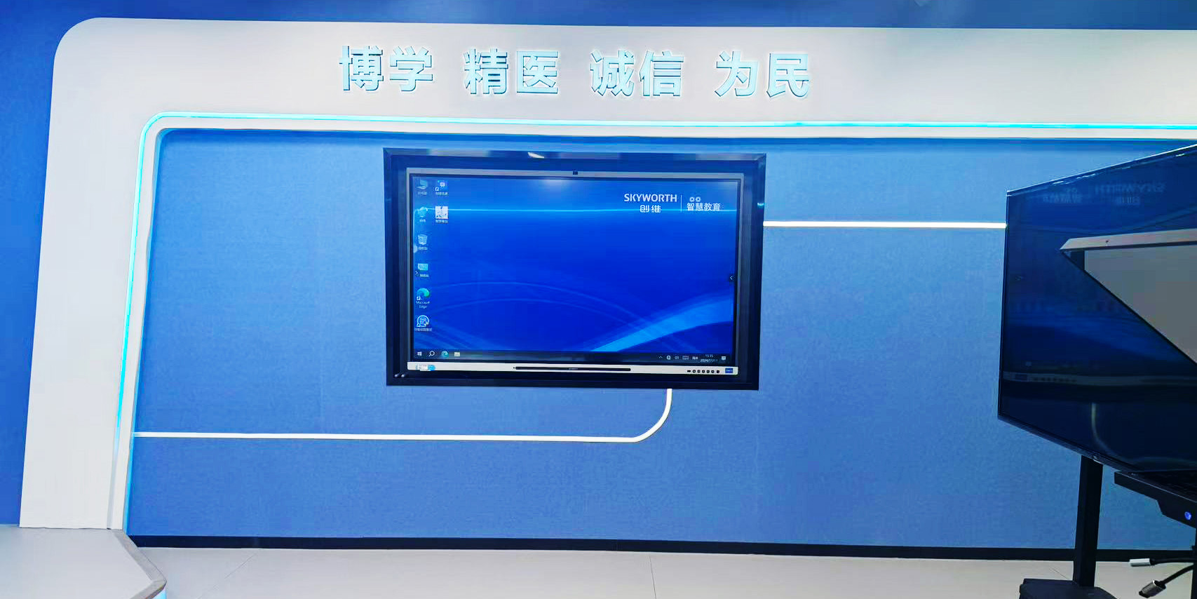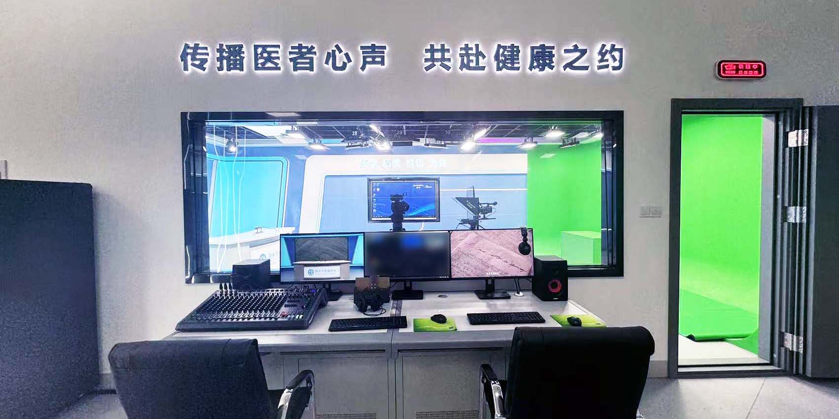 站播区配置一台触摸一体机,方便播报医院新闻,记录医院重大事件,配合“博学、精医、诚信、为民”的院训,可以有效宣传医院的服务态度与行医宗旨。该区域还可以制作精品课程录制、专业技能培训等节目。