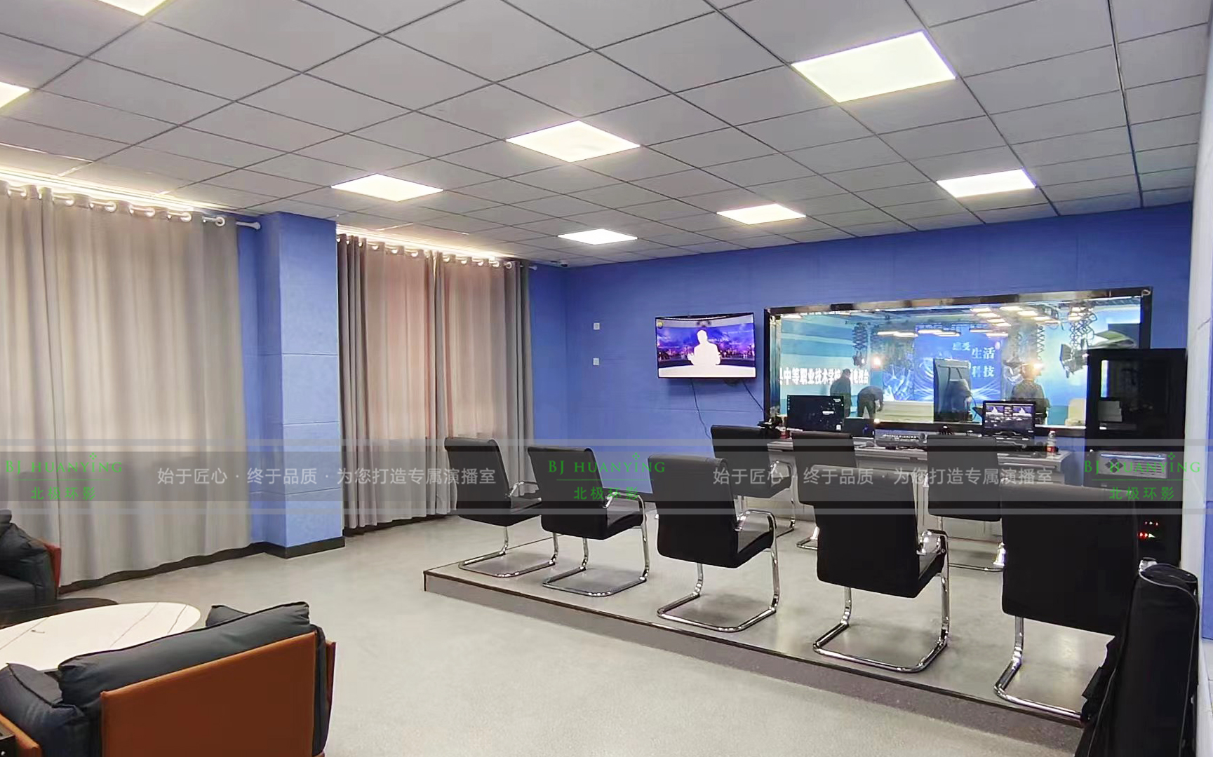 声学系统:演播室装修四周墙面采用吸声材料结构布局,地面布置吸音地毯或地胶板。控制室采用隔断砖混或轻钢结构,为防设备静电,控制室地面采用瓷面防静电地板铺设,美观安全,演播室采用木质防火隔音门。