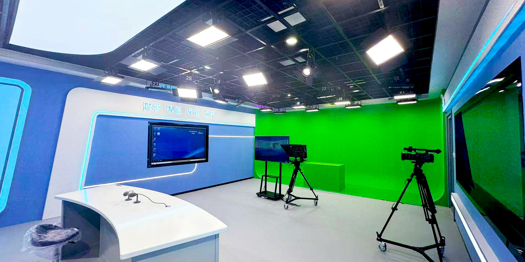 站播区配置一台触摸一体机,方便播报医院新闻,记录医院重大事件,配合“博学、精医、诚信、为民”的院训,可以有效宣传医院的服务态度与行医宗旨。该区域还可以制作精品课程录制、专业技能培训等节目。